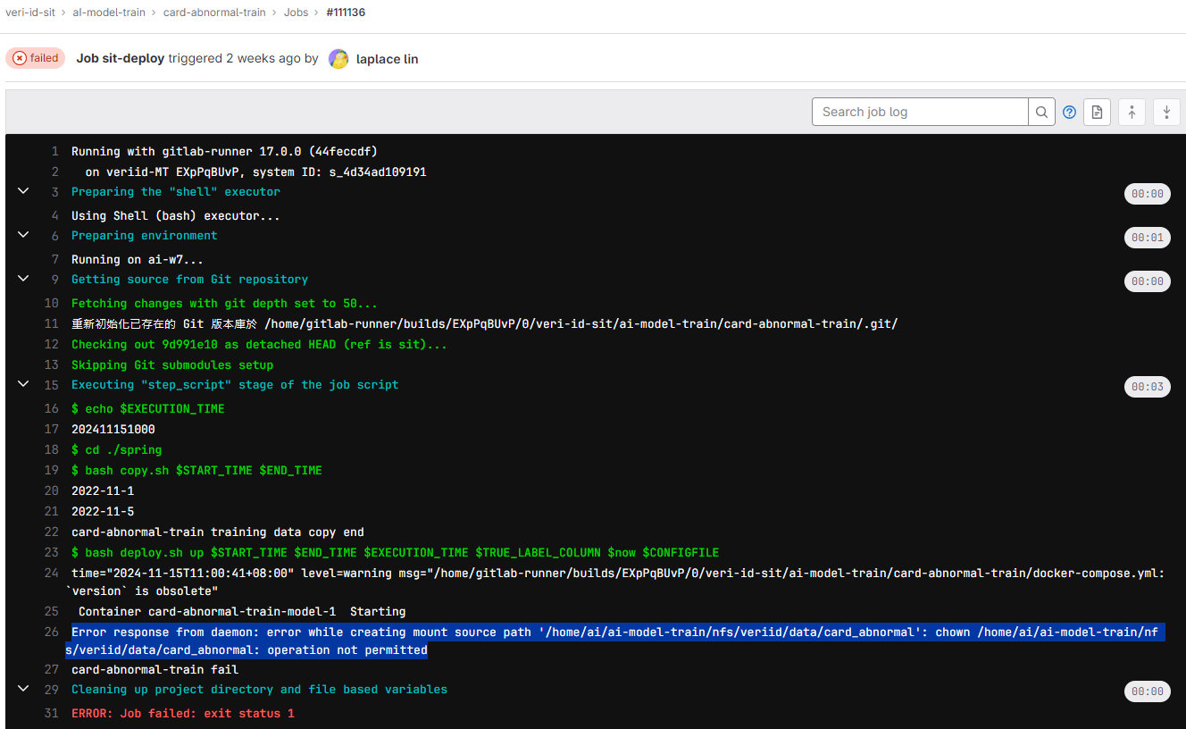 學習系統:veri-id-sit > aI-model-train > ${model} > Build pipelines > Job sit-deploy 階段寫入資料夾權限不足,其他模型訓練也有同樣錯誤